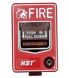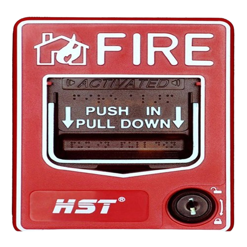 Function: Manual fire alarm trigger – activates system when pressed Operation: Push in → pull down → alarm signal sent to control panel Design: Red ABS plastic, labeled “FIRE”, with reset key slot Mounting: Surface or flush mount Connection: Addressable or conventional (depends on system type) Compatibility: Works with HST fire alarm panels Certifications: ISO 9001, CE Use: Entrances, corridors, emergency exits, public areas Note: Must be installed at accessible height (typically 1.4m from floor)